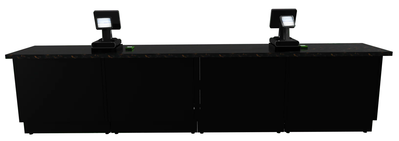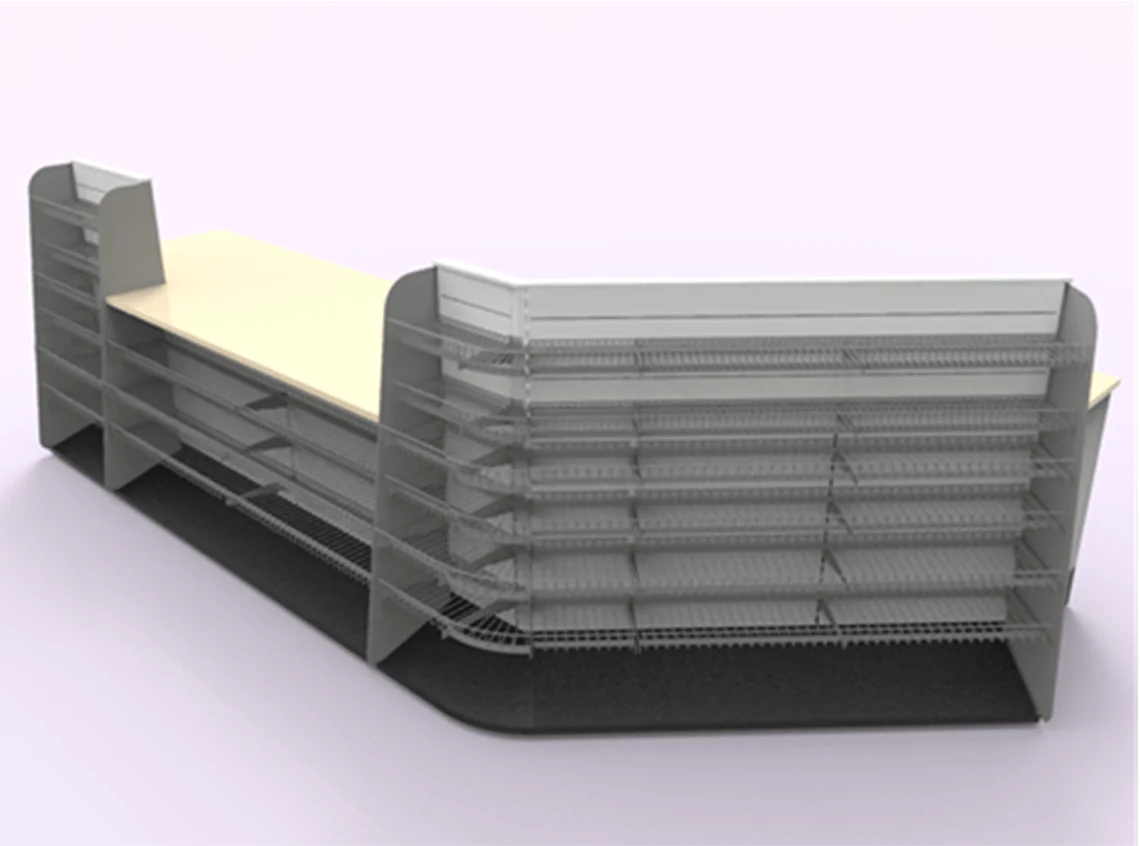 Available with smooth metal, pegboard, slat wall, and mini-slat wall panels, these counters also offer curved sections to enhance your store's layout further. The counter interior on the Clerk's side is fully customizable to accommodate various equipment needs, including interior shelves, cigarette trays, bag holders, printer shelves, trash can areas, drawers, safe openings, and built-in/drop-in lottery displays. With these versatile options, the 4D Sales Counters can be tailored to fit the specific requirements of any retail environment, ensuring both functionality and aesthetic appeal.